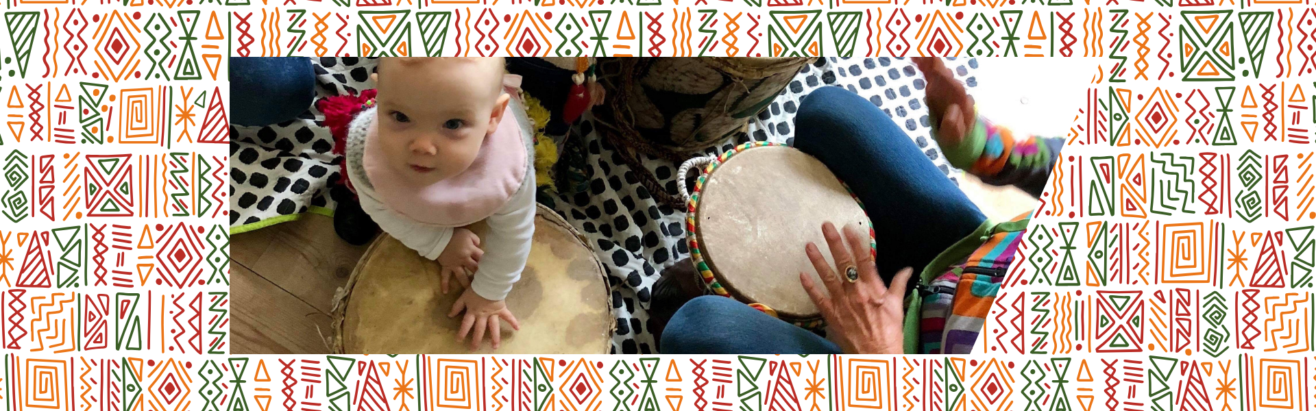 Vi sidder på gulvet, og det myldrer med trommer, rytmeinstrumenter, skåle til at spille i, små dansebælter mm, som vi boltrer os i.