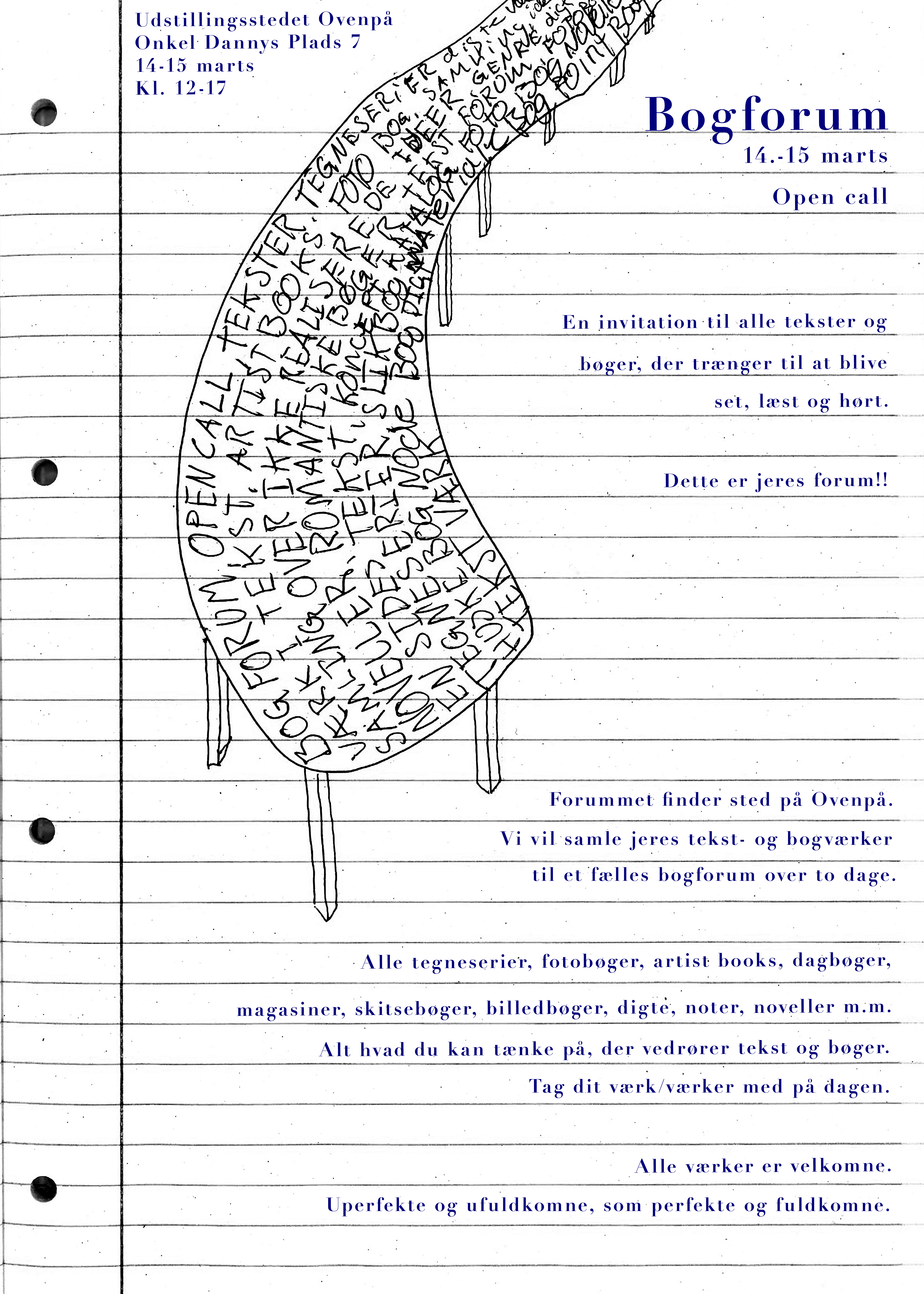 Lørdag den 14. marts: Udstillingen åbner kl. 13:00. Der vil være en åbningsfejring, og omkring kl. 15:00 kan du prøve lykkehjulet med små skriveopgaver. Efterfølgende kan deltagerne tale om og dele deres tekster, hvis de har lyst. Udstillingen lukker omkring kl. 18.