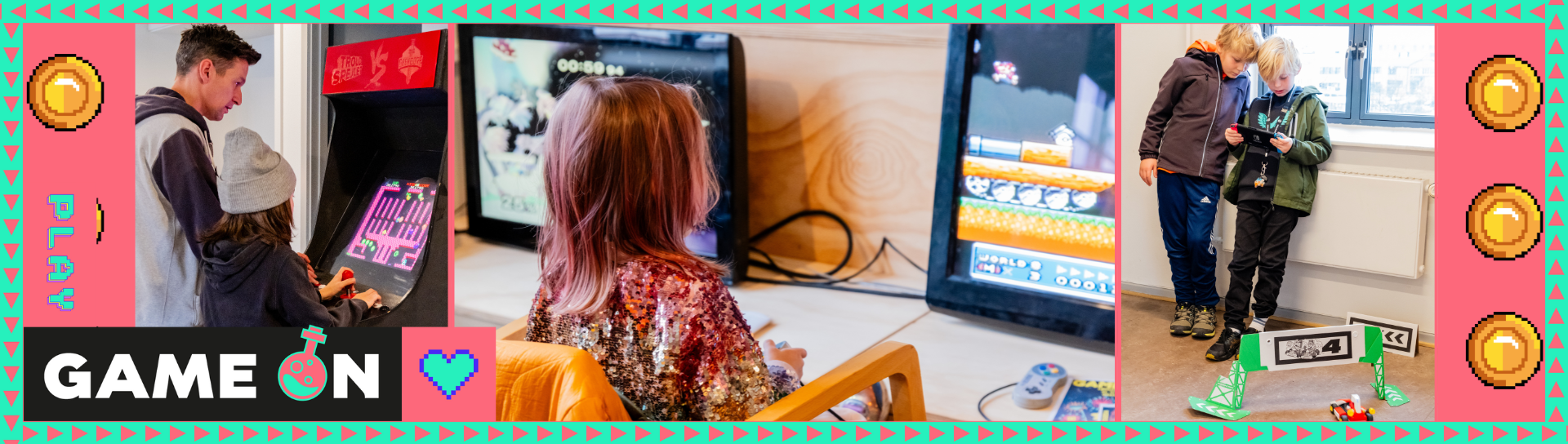 Game On er en ugelang spilfestival, som skaber nye oplevelser med spiluniverser gennem leg, samvær og kreativitet. Vi gamer på computeren, spiller brætspil og hylder de virtuelle verdener, der inspirerer os, kickstarter vores kreativitet og lader os lege lidt længere.