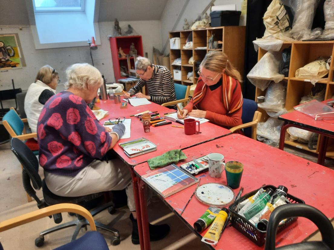 Her kan du male med akryl på lærred, tegne, bruge akvarel, male mandalas eller udforske andre kreative projekter – fra håndarbejde til figurer til dukketeater og dekorative puslespil til børnehaver. Vi afslutter ofte dagen med at vise vores værker frem og give hinanden konstruktiv feedback.