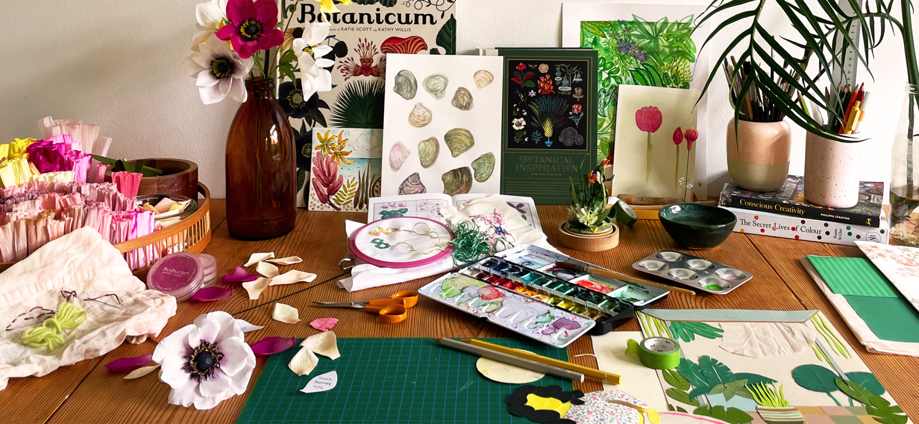 Sammen lader vi det kreative arbejde danne rammen om et fællesskab, hvor der er plads til forskellighed, ro og fordybelse.