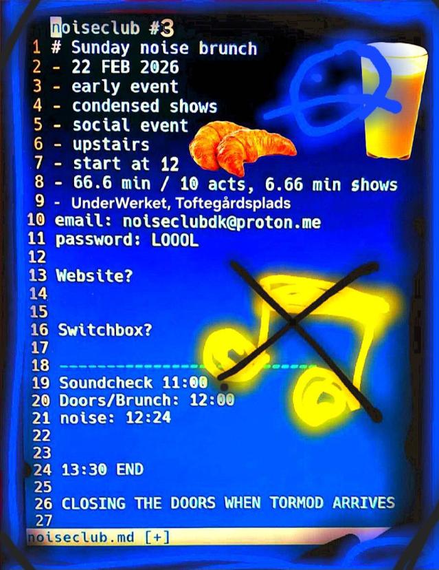 Fællesskaber Mad Musik Unge Voksne Valby NOISE CLUB #3: SUNDAY NOISE BRUNCH NOISE CLUB #3: SUNDAY NOISE BRUNCH 66.6 minutes of noise, 10 acts, 6.66 minute shows And brunch! Sunday 22 Feb 2026In the Kraftwerket dining room Doors open at 12.00Noise starts at 12.24Noise ends at 13.30 Se eventet på Kultur og Fritid V Kontakt KraftWerket Valgårdsvej 2 2500 Valby Del med Kopieret til udklipsholderen