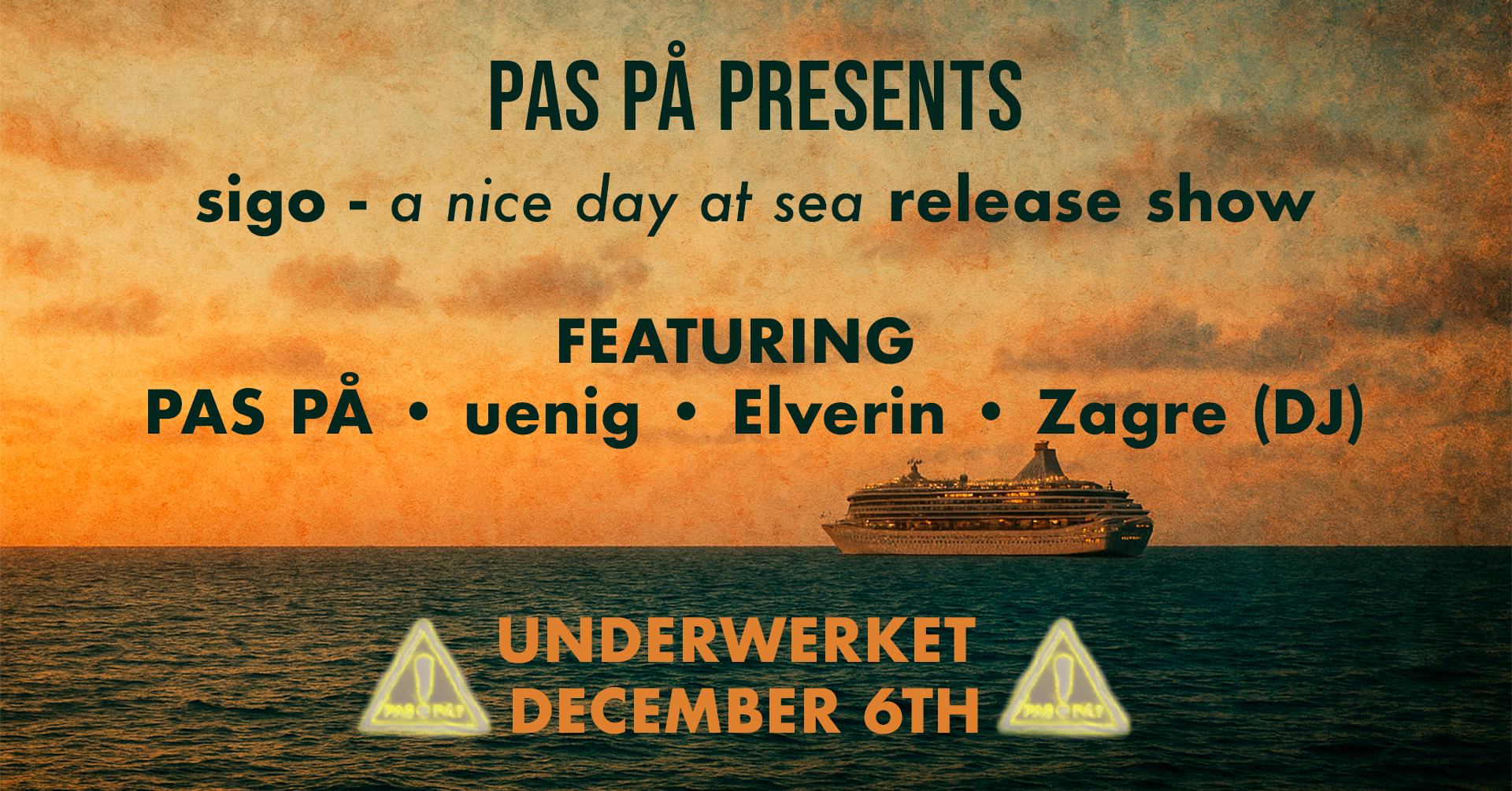 Musik Unge Voksne Valby PAS PÅ PRESENTS Sigo - A nice day at sea release show FEATURING PAS PÅueningElverinZagre (DJ)Surpise? Se eventet på KraftWerket Kontakt KraftWerket Valgårdsvej 2 2500 Valby Del med Kopieret til udklipsholderen