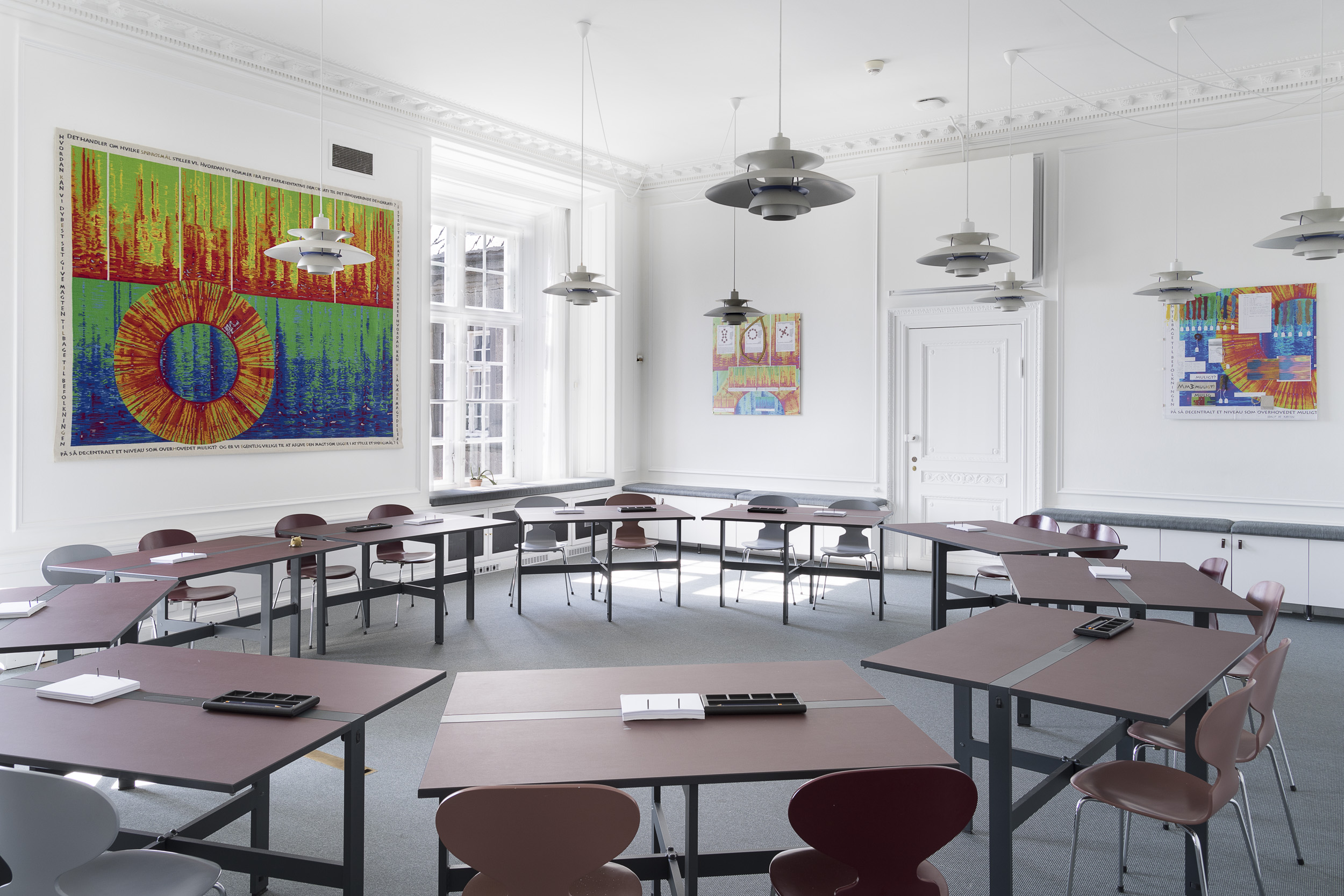 Hvordan kan lyd blive til et fysisk kunstværk, der former oplevelsen af et politisk rum? Denne samtale tager afsæt i billedtæppet SPØRGSMÅL FORMER VIRKELIGHEDER – en vævning af lyden i rum 2-015 den 18.05.2017, som til daglig udsmykker et af Folketingets gruppelokaler. Værket bygger på en lydoptagelse fra et møde hos Alternativet den 18. maj 2017 i gruppelokale 2-015 og er i øjeblikket indlånt til Københavns Museum som en del af særudstillingen Lyden af København – Støj, Stemmer og Stilhed.