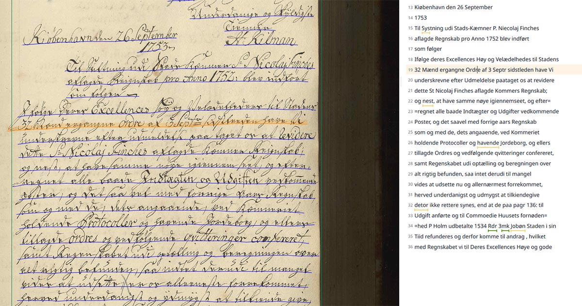 I dette projekt korrekturlæser vi protokollerne fra Stadens 32 Mænds råd fra perioden 1753-1840. Rådet skulle vejlede Magistraten om københavnske forhold og måtte foretræde for kongen. De 32 mænd var primært borgere fra den fineste del af borgerskabet. Protokollerne er fulde af spændende historier om 1700-tallets København og har ikke før været transskriberede.
